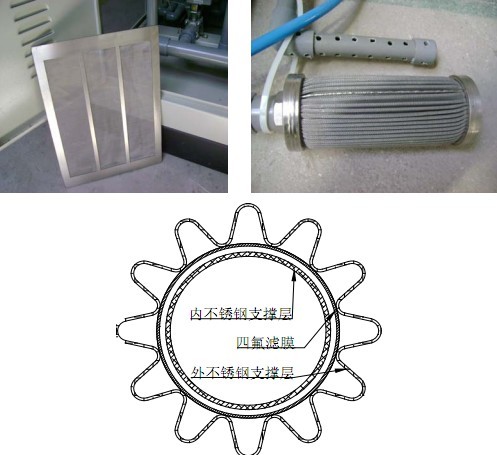 2.采用三级过滤方式完成水样预处理。前两级为粗滤,均采用大面积滤板,透过率高,清洗彻底;第三级为精滤,采用滤芯状膜式过滤,可以同时安装两种不同精度的滤芯,给不同过滤要求的仪器使用。该滤芯具有:过滤精度控制准确,耐腐蚀性好,透过率高,阻力小,结构坚实可高压反清洗,不需人工维护等优点。第三级滤芯内部结构如下图所示: